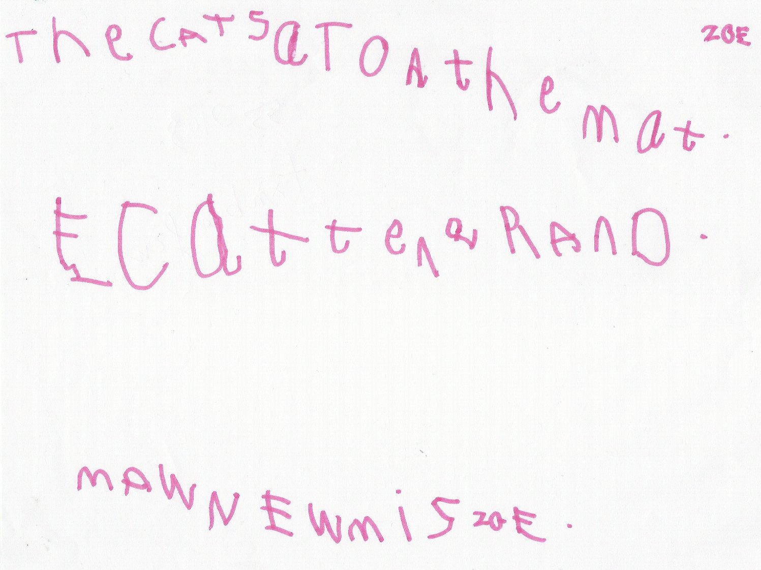 Elle est très motivée, mais on pense que l’école aide aussi beaucoup. Ils n’apprennent pas tous la même chose au même moment : la maîtresse adapte les exercices au niveau de chacun. Zoé nous a décrit un des exercices qu’elle fait en petit groupe : la maîtresse dit un mot, et ils doivent l’écrire sur un papier. Ce sont des petits mots de 3 lettres, sans piège, par exemple cat ou dog.
