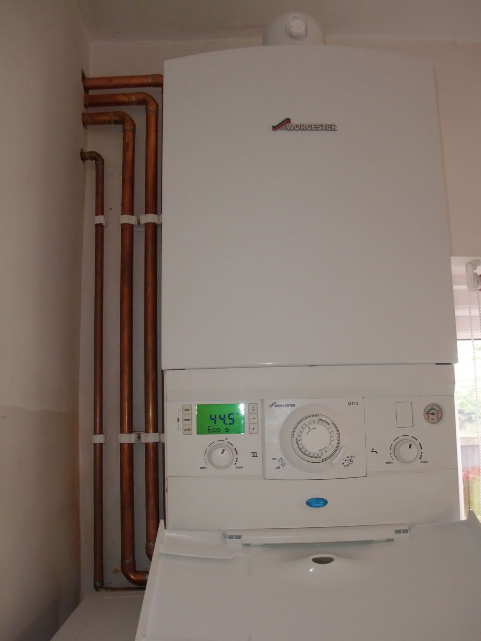 Voilà, on a craqué ! Ou plutôt, on a trouvé un plombier qui nous a été recommandé par une connaissance, et qui nous a semblé sérieux. Il nous a débarrassé de nos deux vieux machins, et a remplacé le tout par un combi boiler comme on dit, c’est à dire qu’il fait à la fois chauffage et sanitaire, et à condensation pour que ce soit plus efficace.
