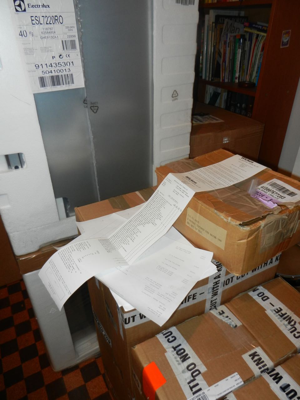 Ça a en fait commencé vendredi, où on nous a livré… 120 paquets ! Bon, OK, chacune des 29 poignées comptait comme un paquet, mais également le four ou le lave-vaisselle, qui sont un peu plus imposant, dans notre salon. On arrive encore à regarder la télé, par miracle.