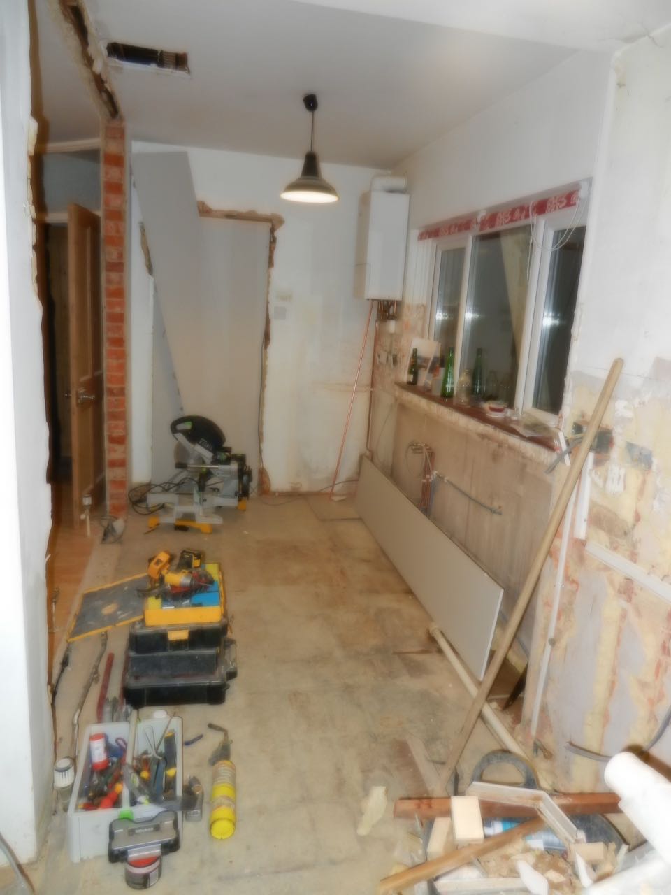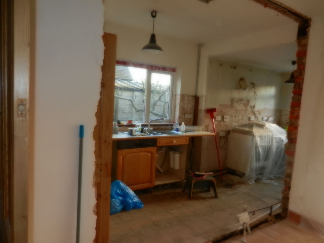 Mercredi on continue dans la poussière, avec l’électricien qui fait des tranchées dans les murs qui restent, et la porte de la cuisine qui est remplacée par une cloison. L’évier a disparu, donc on fait la vaisselle dans le lavabo de la salle de bains… De toute façon, il n’y avait ni eau ni électricité toute la journée, donc le midi c’était tartines de pâté !