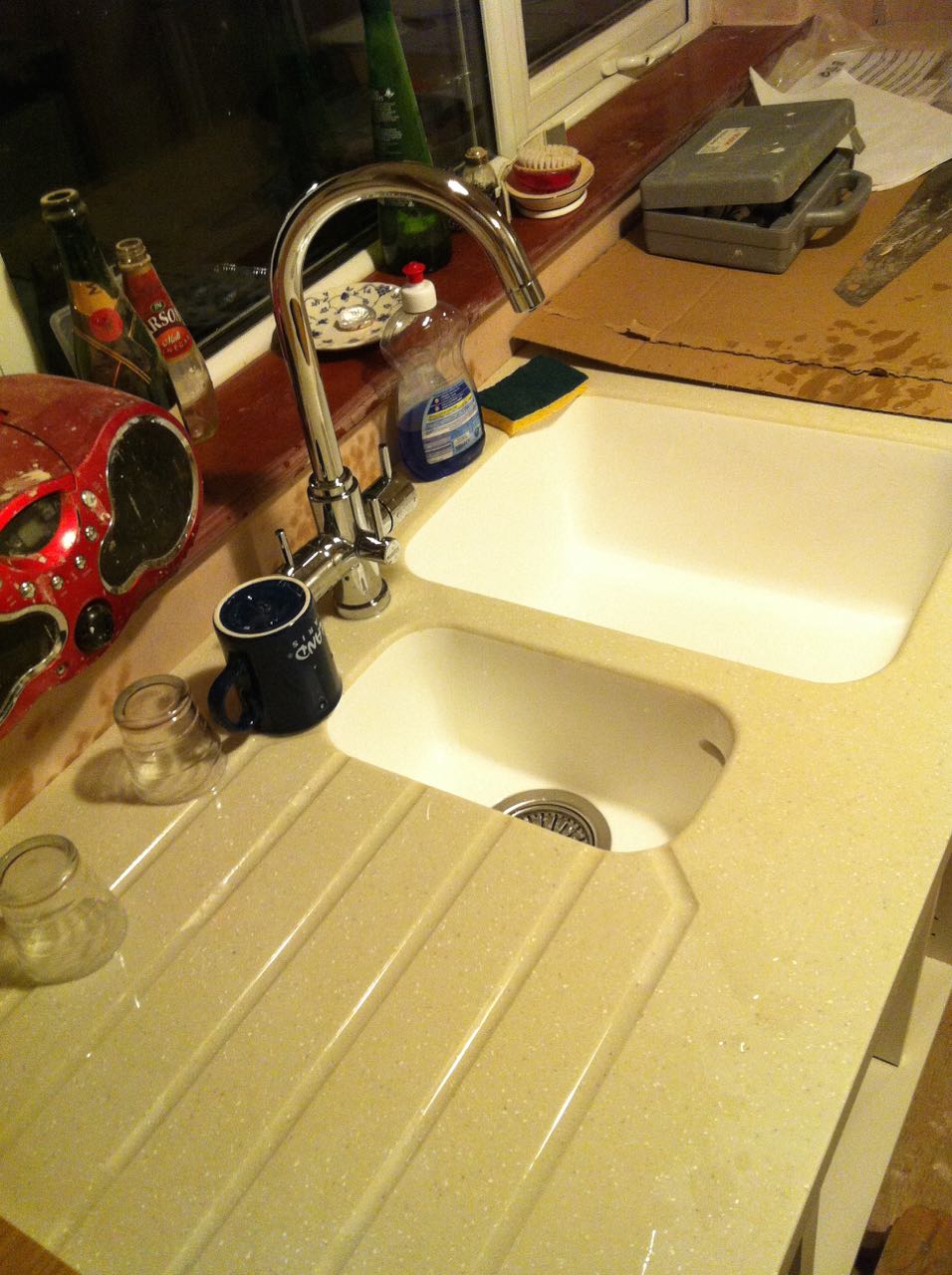 Mais aujourd’hui une grande étape a été franchie : le fameux robinet est installé — avec son évier tout neuf ! Vous noterez qu’il n’a aucun joint : le bac se transforme en évier, qui se transforme en plan de travail. Vive les cuisines modernes !