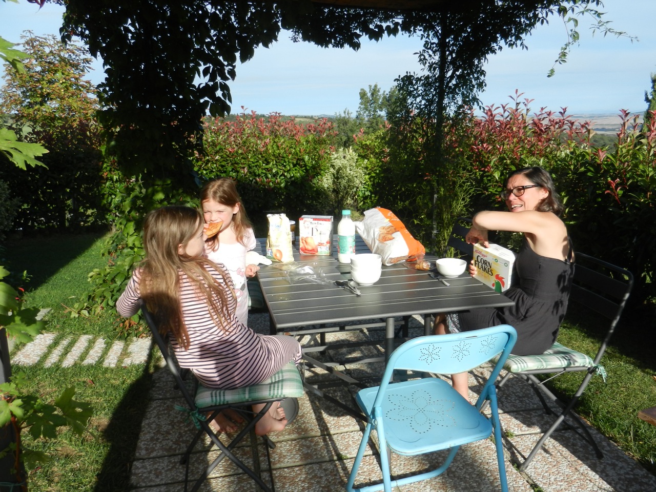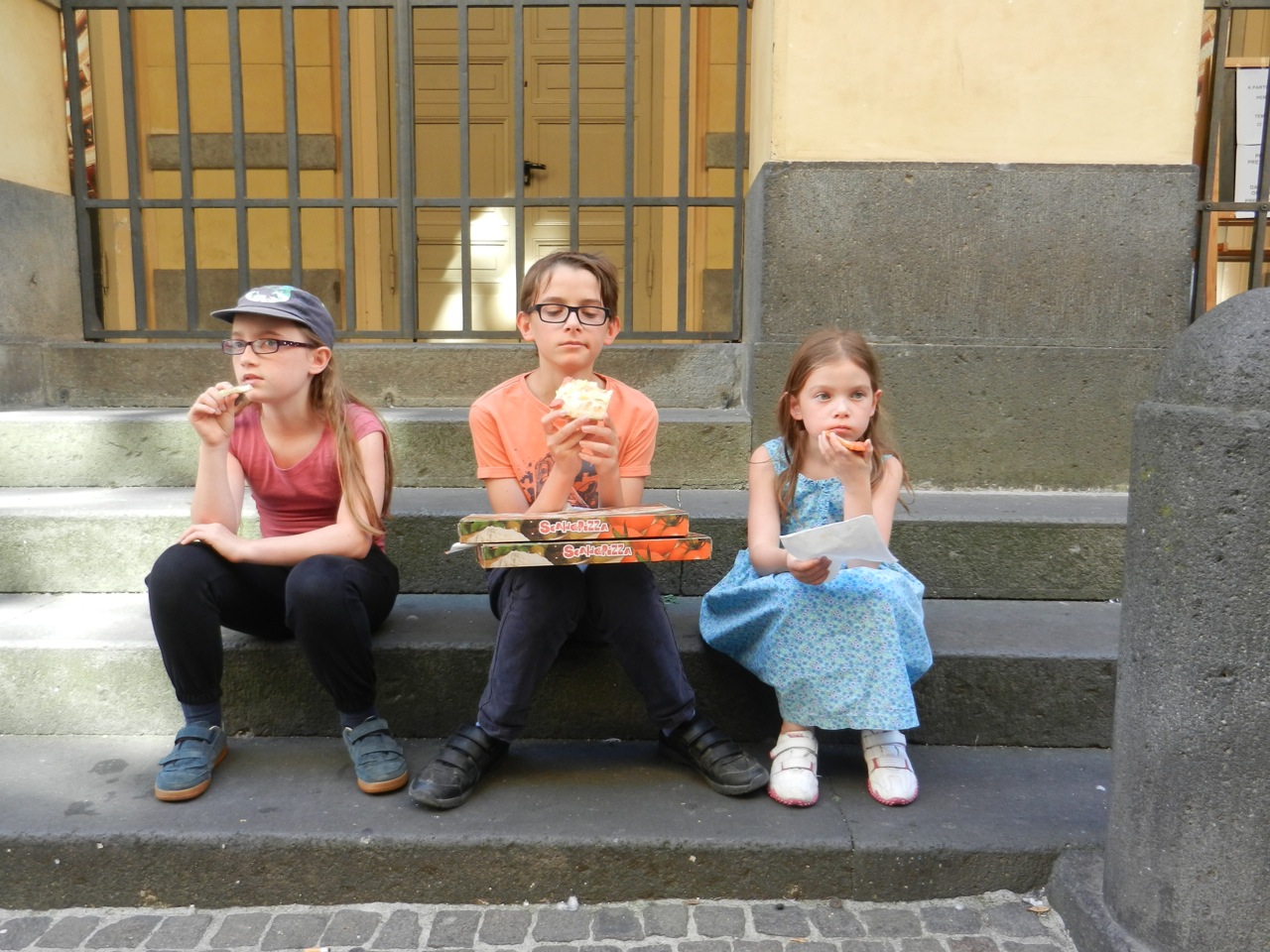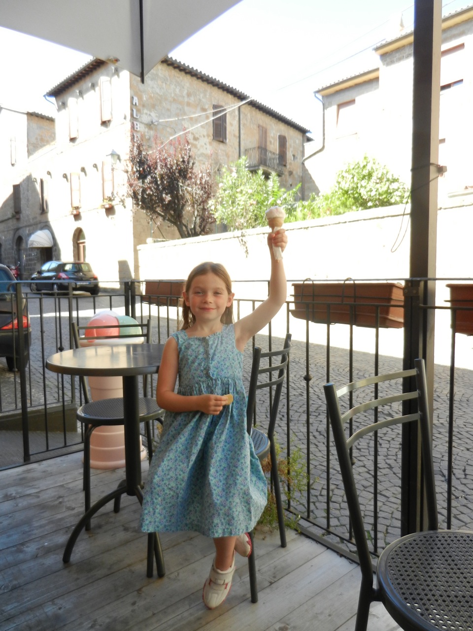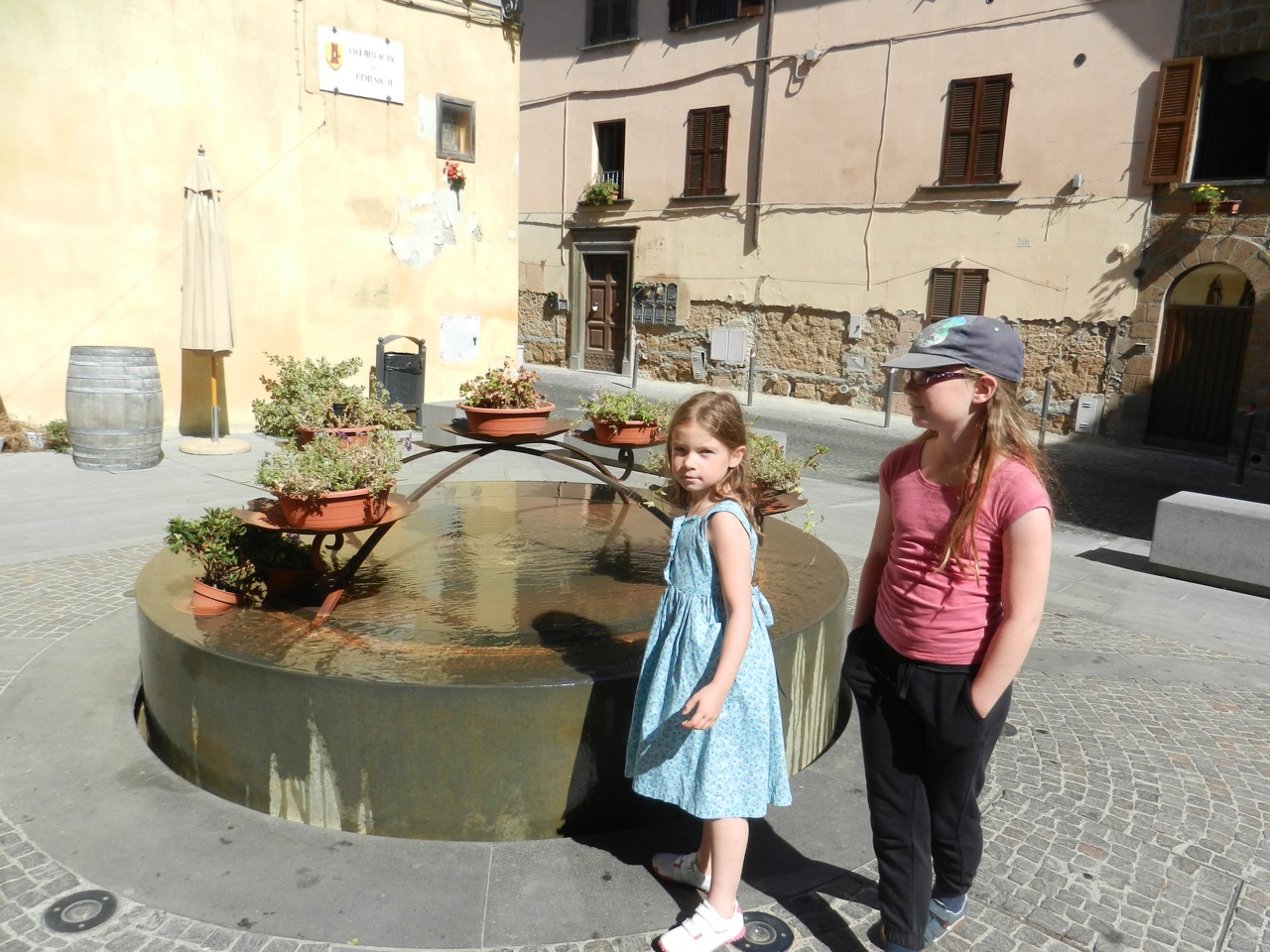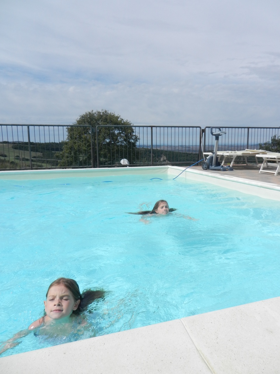 On pensait manger au restau, mais le pauvre Gaël ne se sentait pas très bien, et on a donc acheté du bon saucisson, du pain et du panforte (miam !) et sommes rentrés manger “chez nous”. Gaël a pu faire une bonne sieste qui l’a réparé, et les filles ont piqué une tête rapide dans la piscine — mais elle était apparemment bien froide !