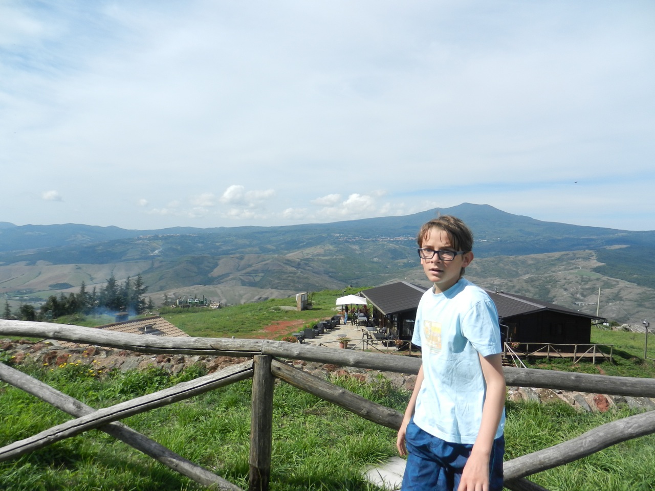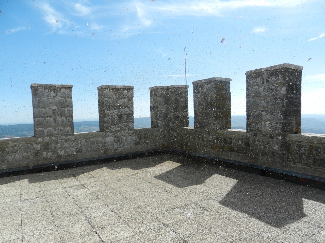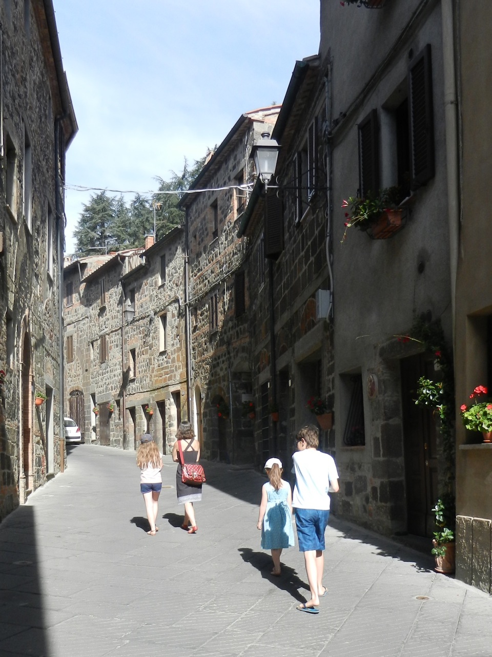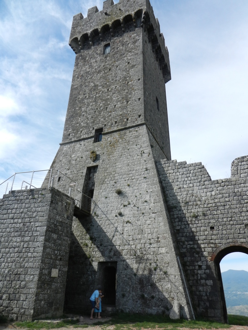 Le lendemain matin s’est posé la question du petit déjeuner ! On n’avait aucune provision, et je suis donc parti le nez au vent, en suivant ce que le GPS pensait être la supérette la plus proche. Quelques déconvenues plus tard, je suis tombé sur une minuscule épicerie à Radicofani, qui nous a sauvé la matinée. Le village était tellement joli qu’on y est retourné, le ventre plein, pour monter tout en haut de la montagne et y visiter la forteresse. La vue était magnifique, mais le haut de la tour était envahi de milliers de fourmis volantes, que les enfants n’ont pas du tout aimées !