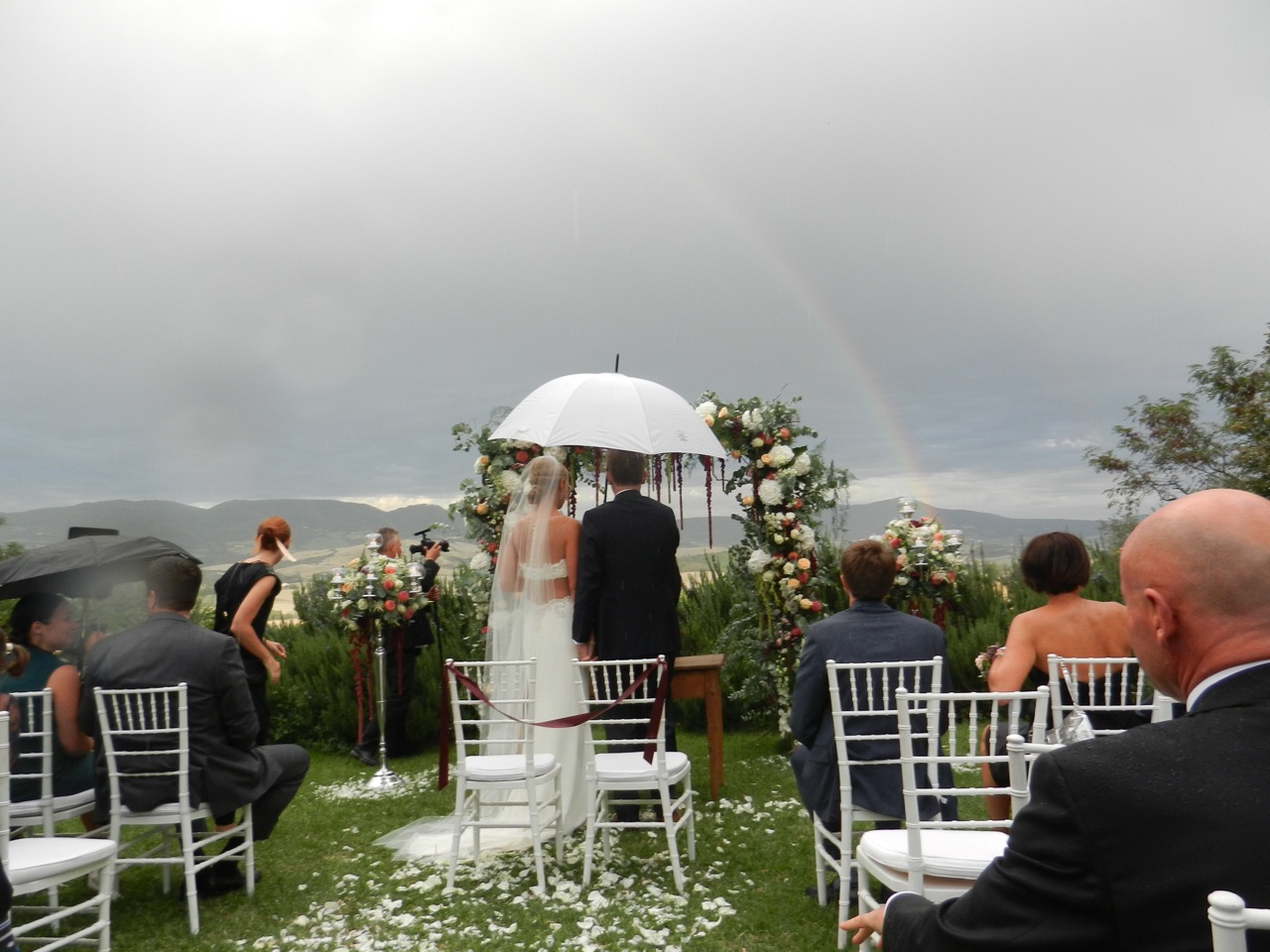 Ensuite, habillage en grande pompe, et direction le mariage ! La cérémonie était à l’américaine : dehors, et devant un portique de fleurs. Il ne faisait pas très chaud, et on a même eu une petite averse. Pas de quoi nous inquiéter, nous qui sommes habitués à bien pire ! Mais les Italiens sont vite partis se mettre à l’abri… L’avantage, c’est qu’il y a eu juste au bon moment et juste au bon endroit un arc-en-ciel magnifique, qui rend très bien sur les photos !