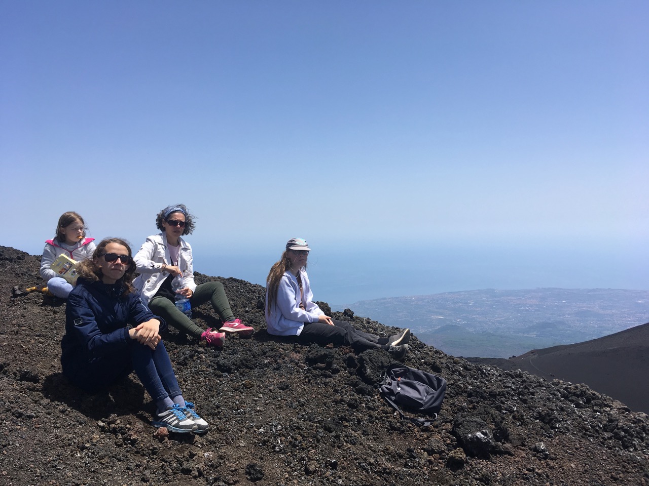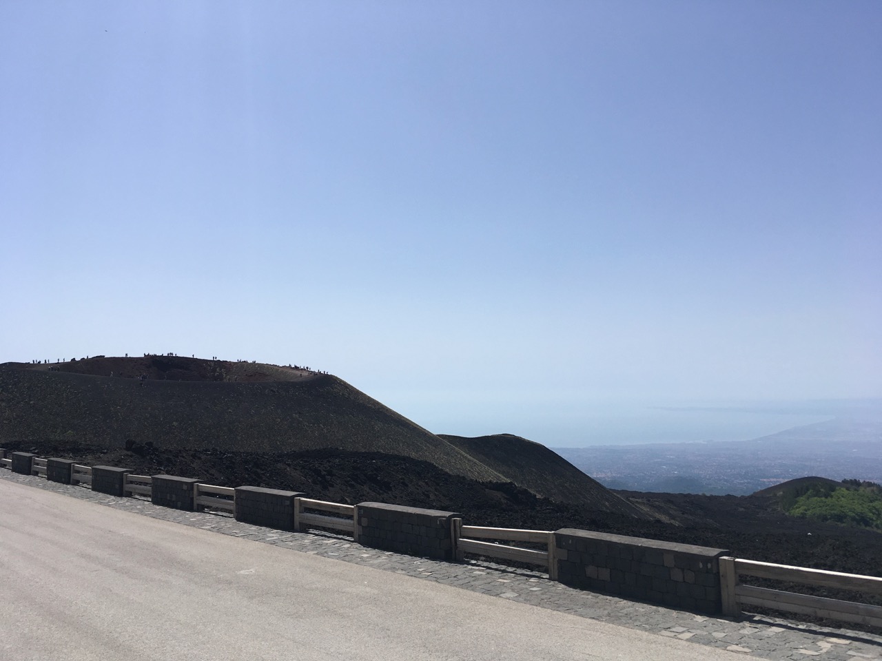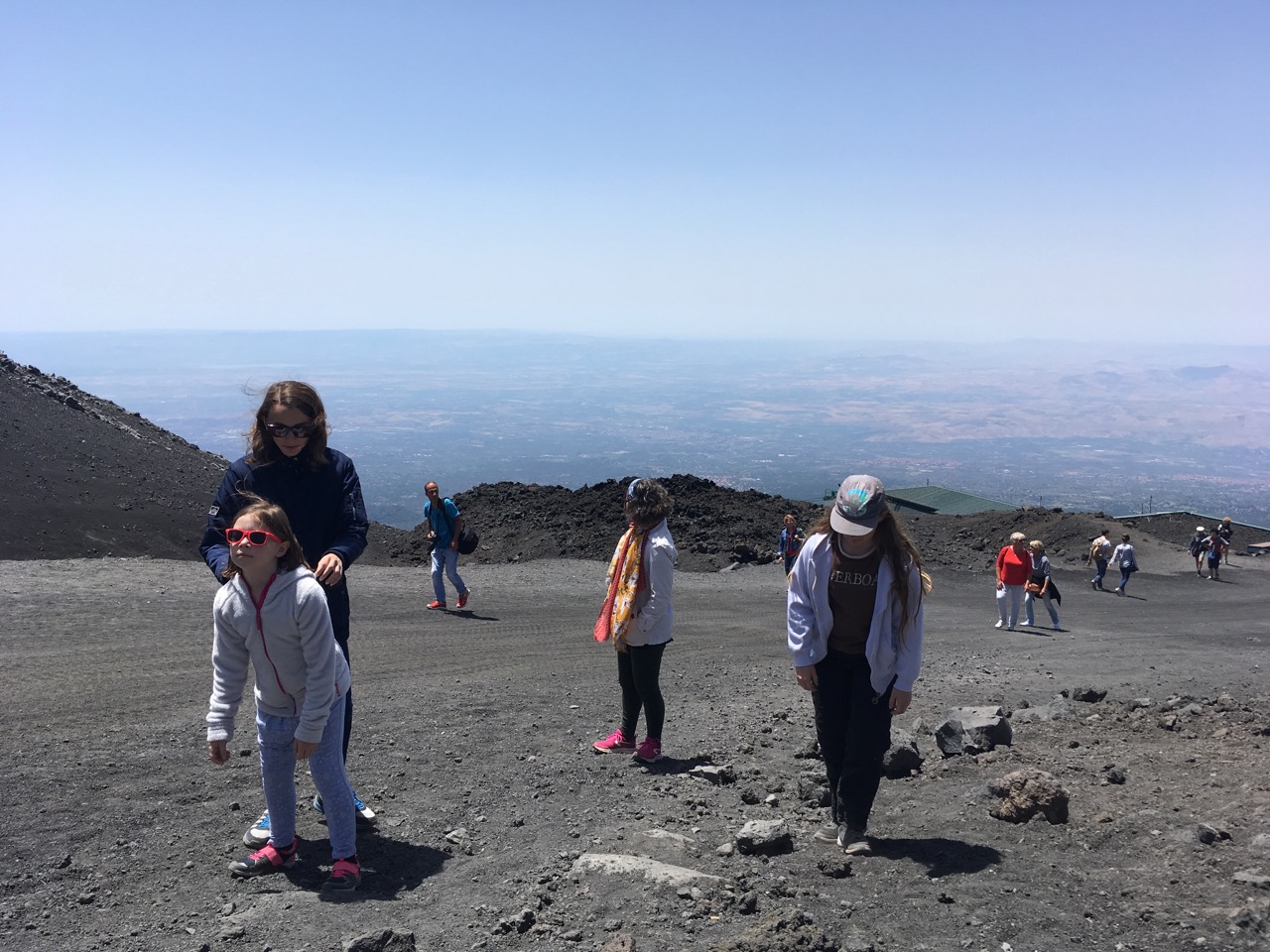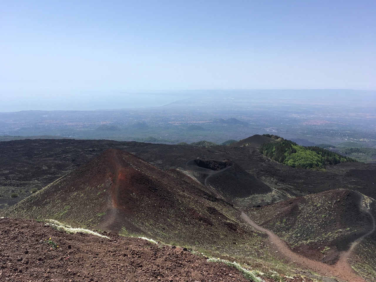 Finalement, on y arrive, et la vue d’en haut est magnifique, avec les coulées noires sous nos pieds, la plaine verte ensuite, la ville de Catane ocre, et la mer bleue dans le lointain. Ah oui, et le paquet de gâteaux, aussi…
