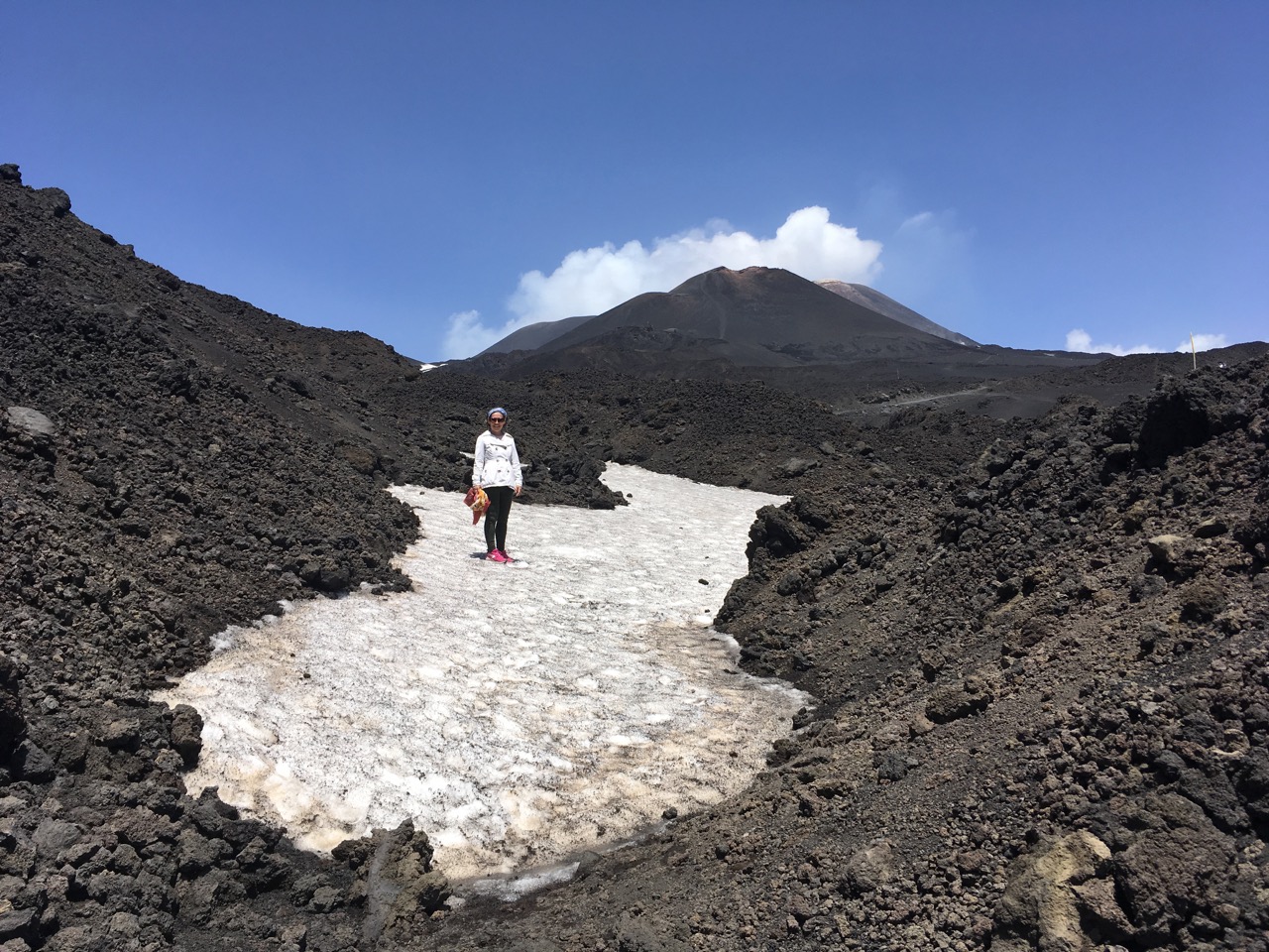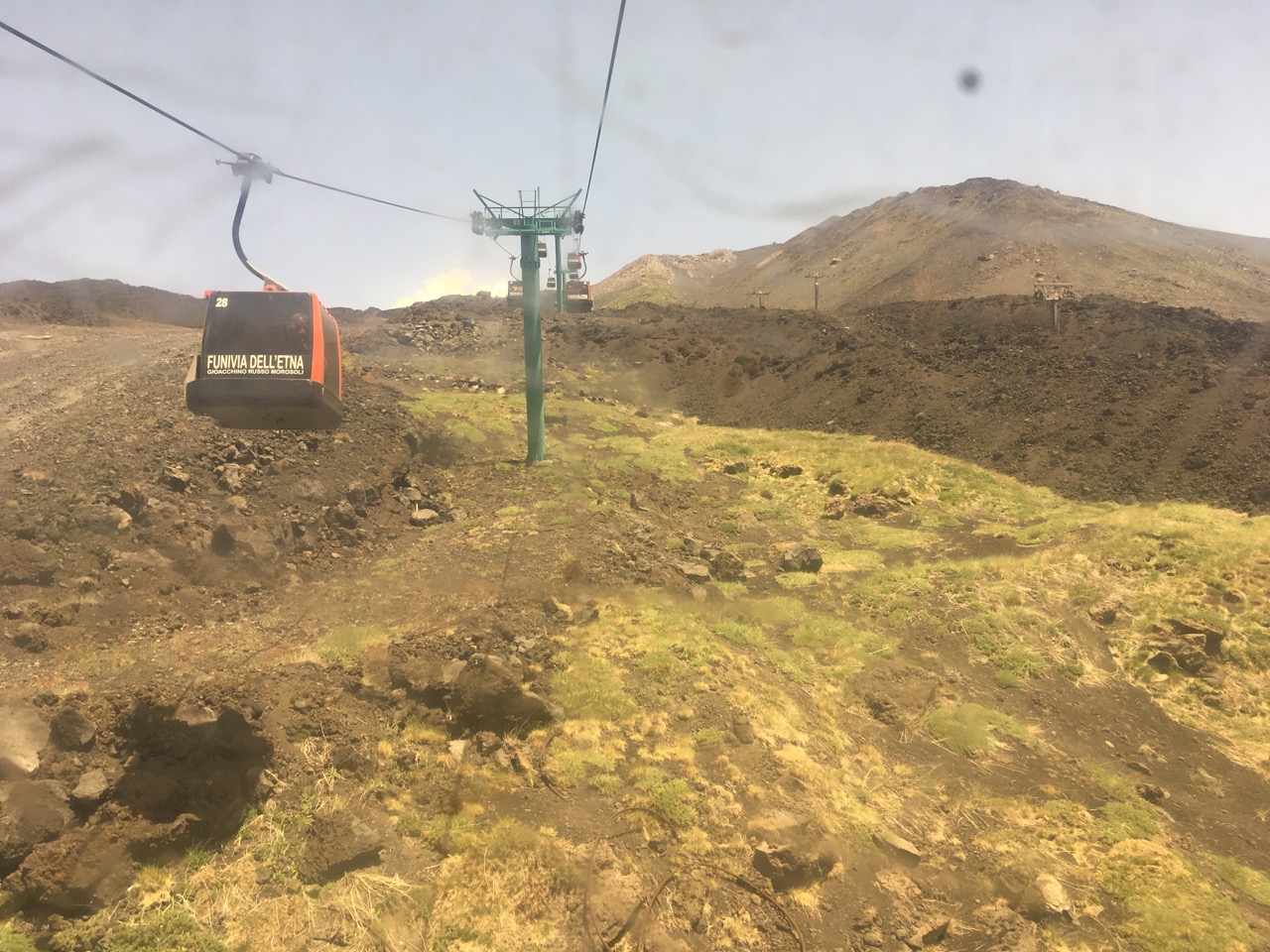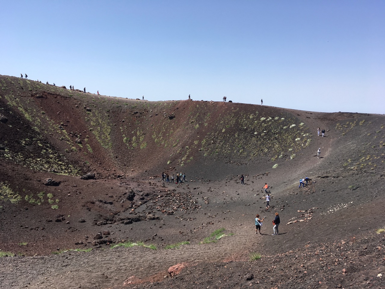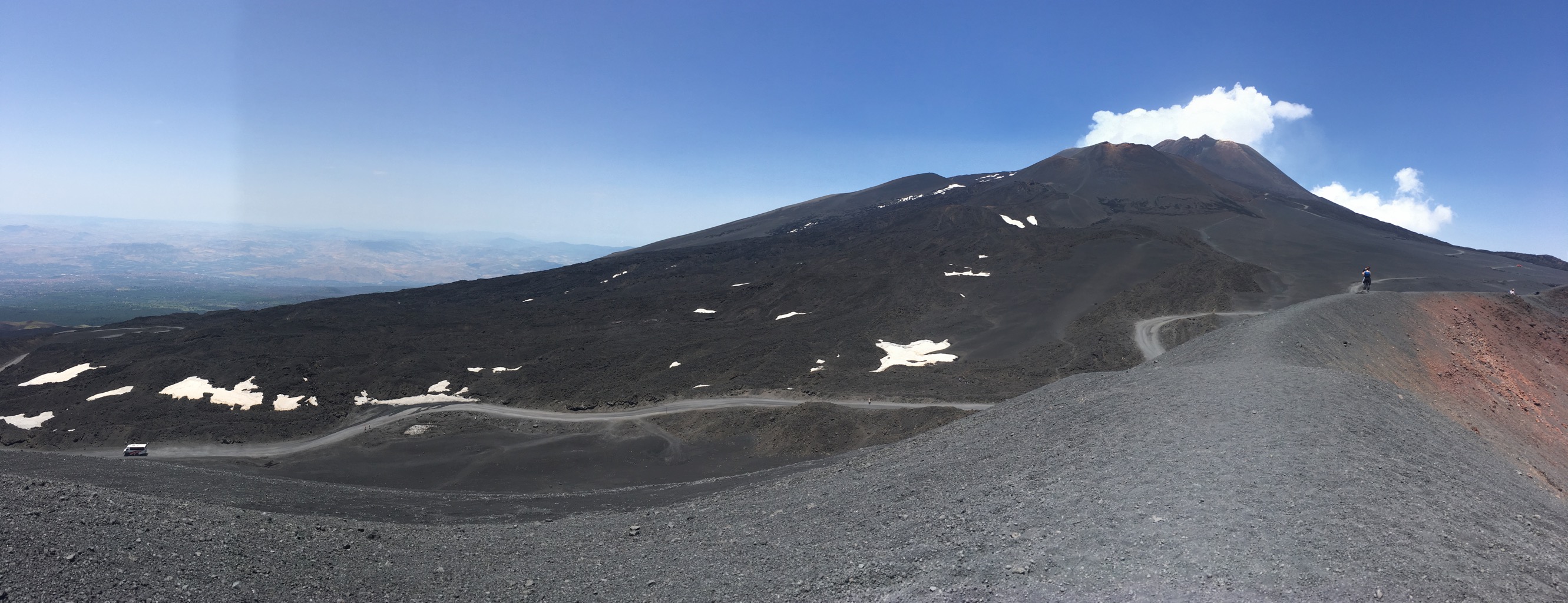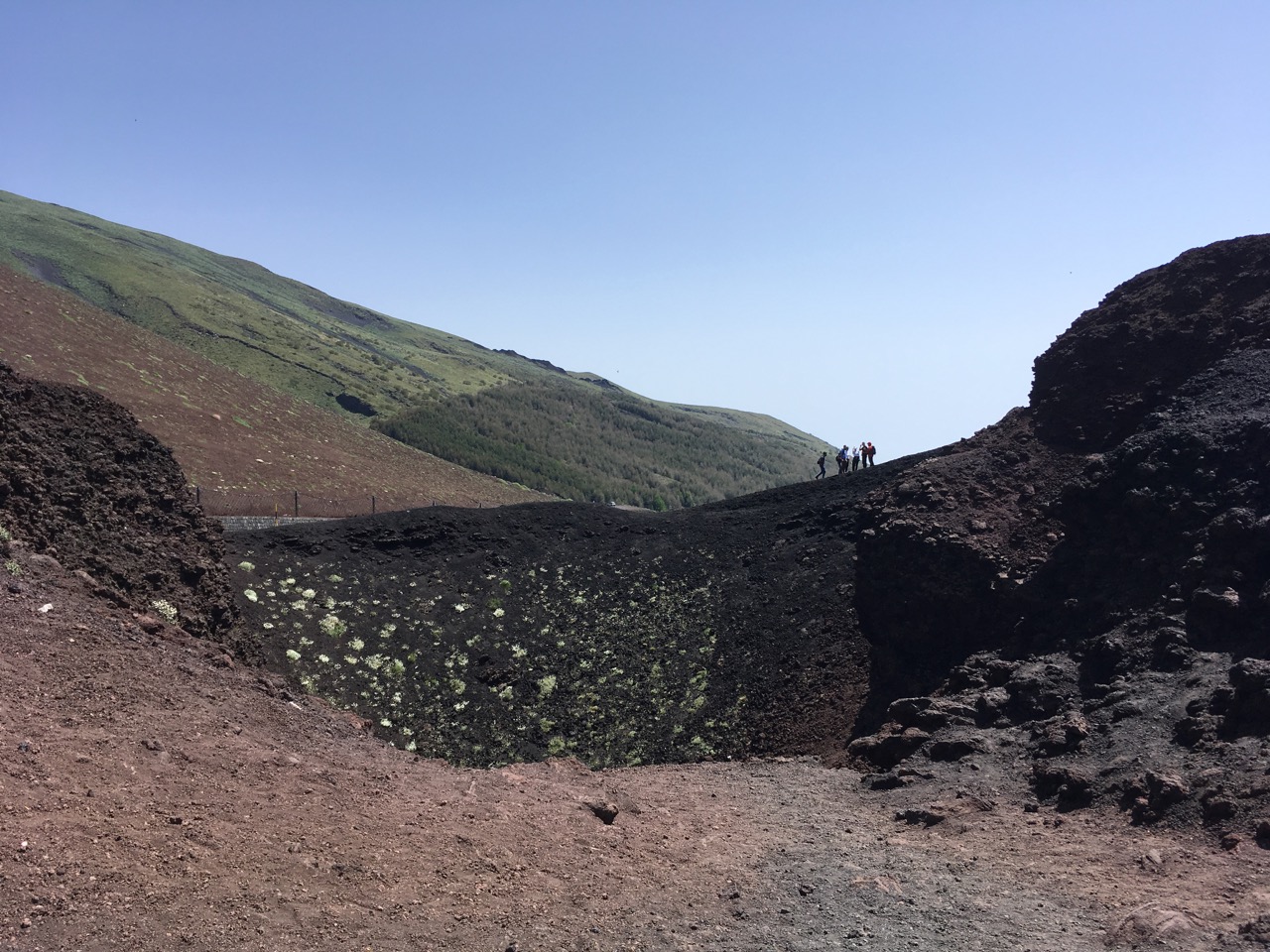 Finalement, on y arrive, et la vue d’en haut est magnifique, avec les coulées noires sous nos pieds, la plaine verte ensuite, la ville de Catane ocre, et la mer bleue dans le lointain. Ah oui, et le paquet de gâteaux, aussi…
