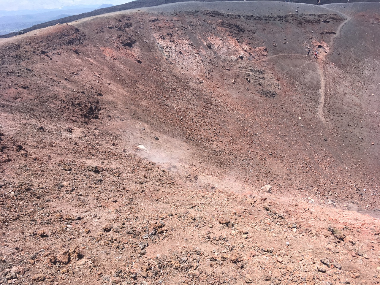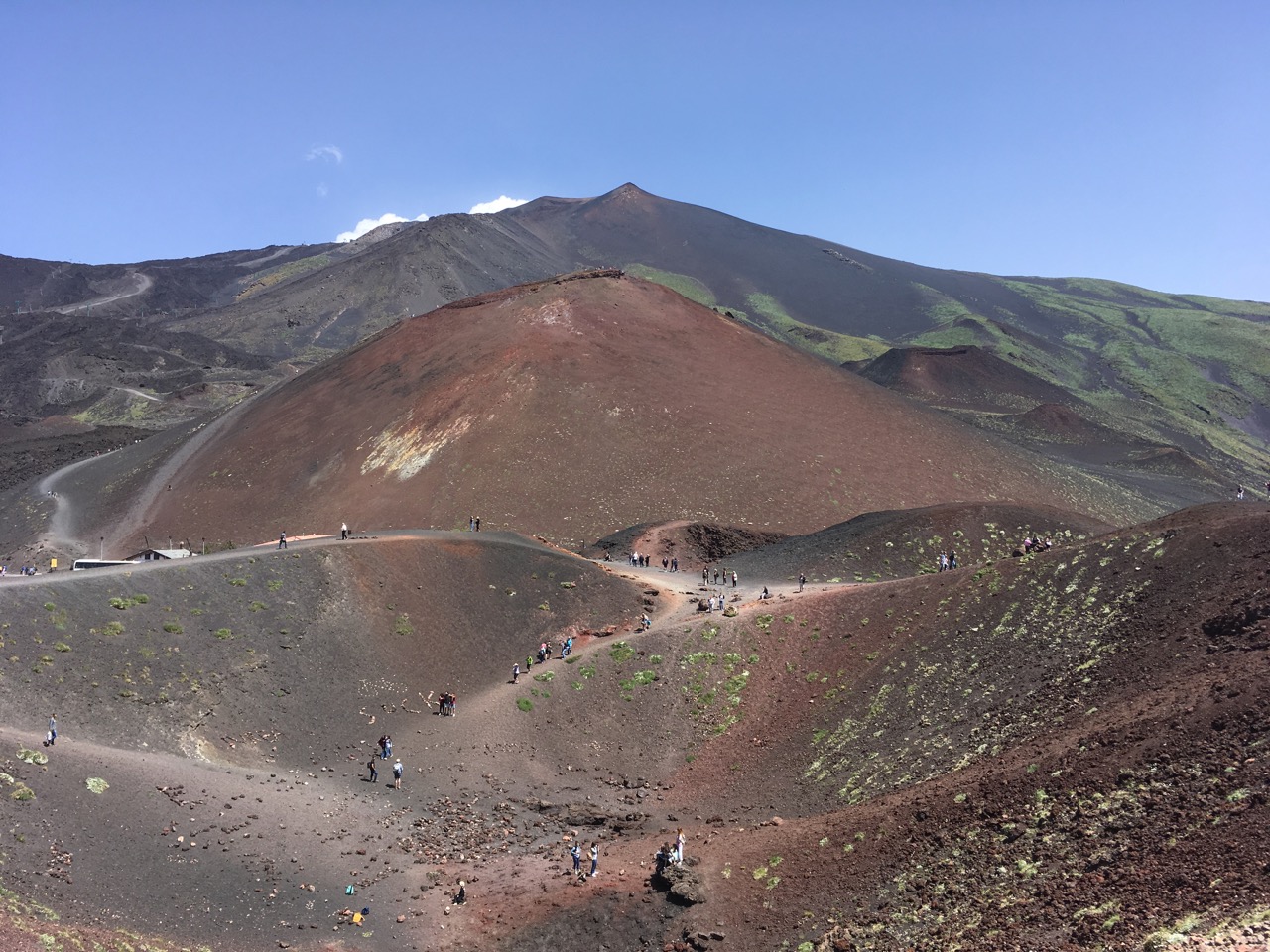 Au parking, on retrouve les inévitables boutiques à touristes, restaurants, etc. Mais aussi les petits cratères Silvestri. On en escalade un pour se mettre en jambe. On se retrouve au milieu d’un paysage lunaire, avec des cailloux qui ne pèsent rien, allant du rouge au noir. Mais c’est trop facile, et pas assez dépaysant ; on veut aller plus loin !