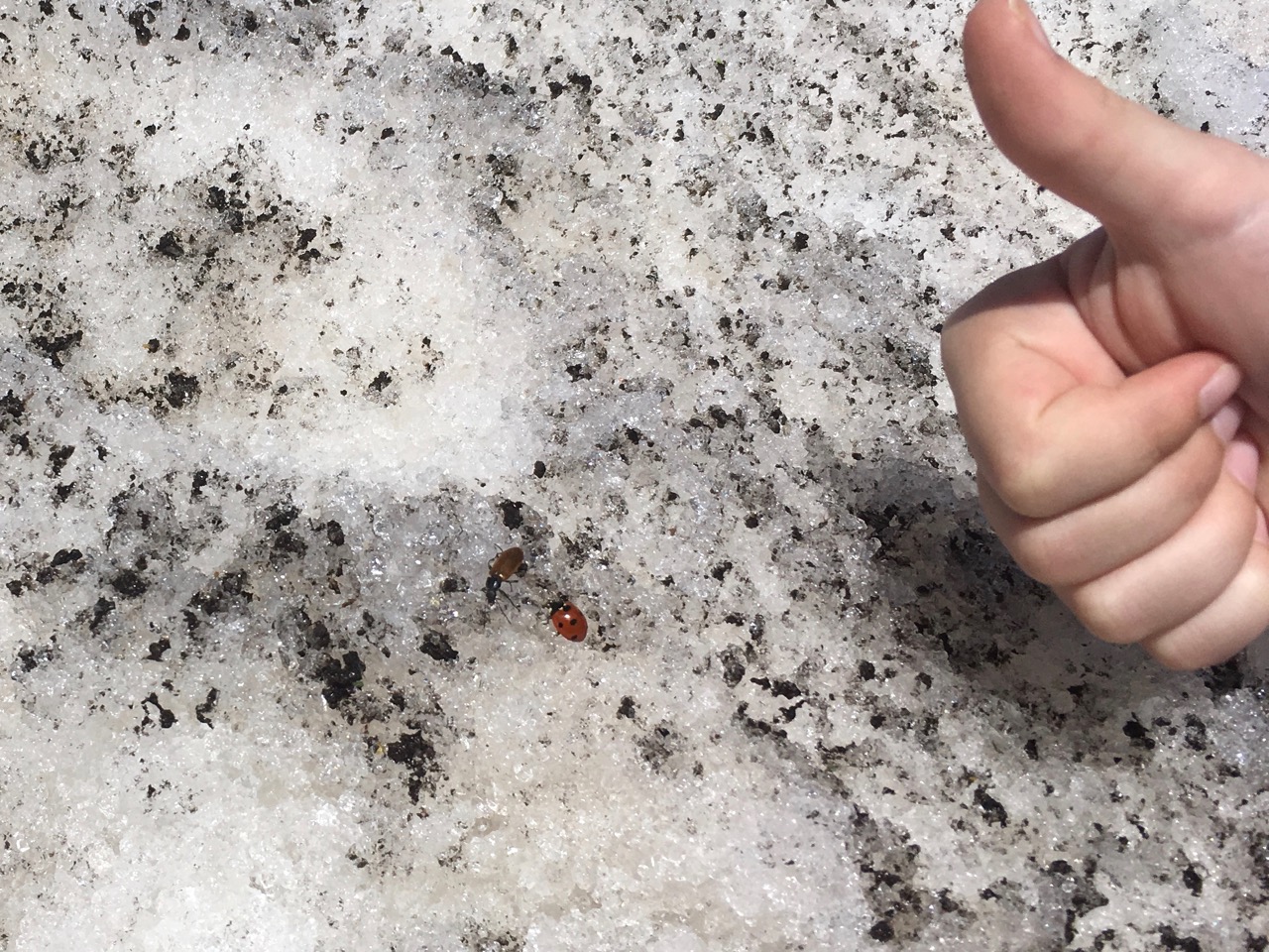De toute façon, on a faim, c’est l’heure de la pause déjeuner. C’est là qu’on voit un peu plus loin un endroit tout blanc : c’est de la neige ! On s’installe à côté et on sort notre pain et saucisson. (Oui, on est toujours très français, surtout sur la nourriture…). Bizarrement, on croise aussi pas mal d’insectes, alors qu’il n’y a quasiment aucune végétation : coccinelles, papillons, scarabées, abeilles, …