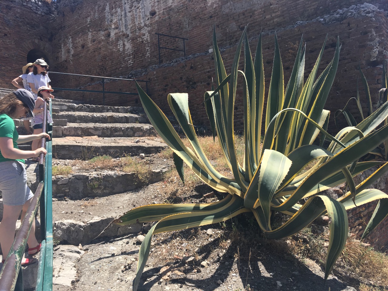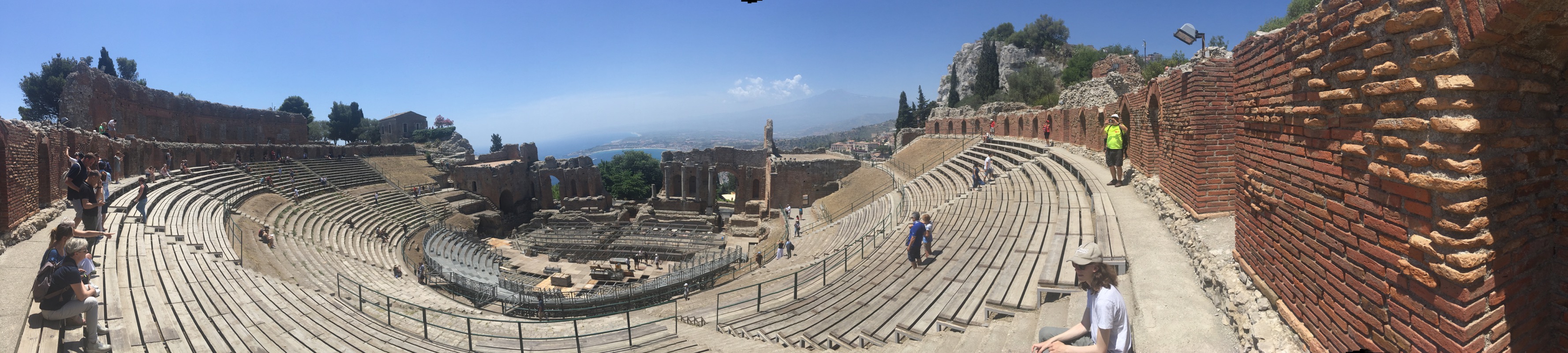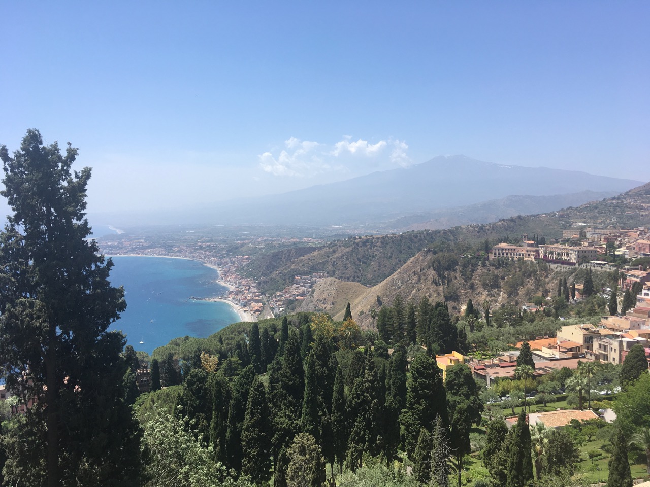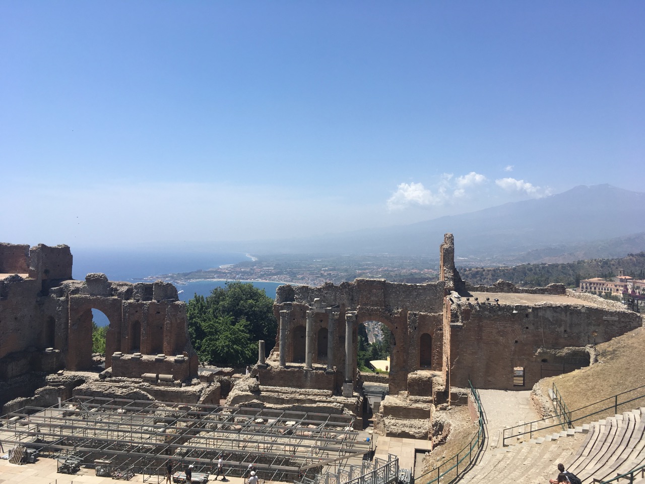 L’attraction principale est le grand théâtre grec, rénové par les Romains il y a environ 1700 ans… Il en manque un peu des bouts maintenant, mais c’est finalement très bien, parce que la vue derrière est somptueuse. Avec en fond l’Etna, bien sûr ! Une scène est en train d’y être installée pour des spectacles cet été. On a du mal à se détacher de cet endroit magique.