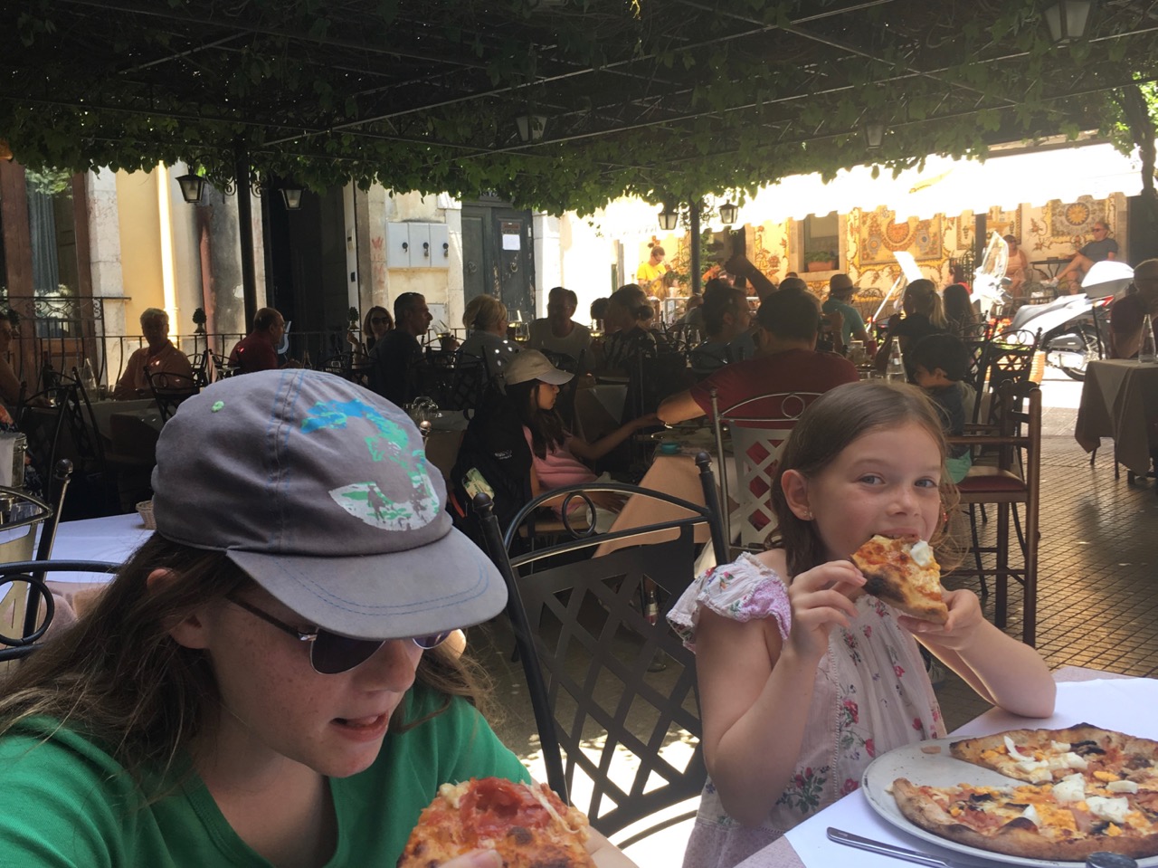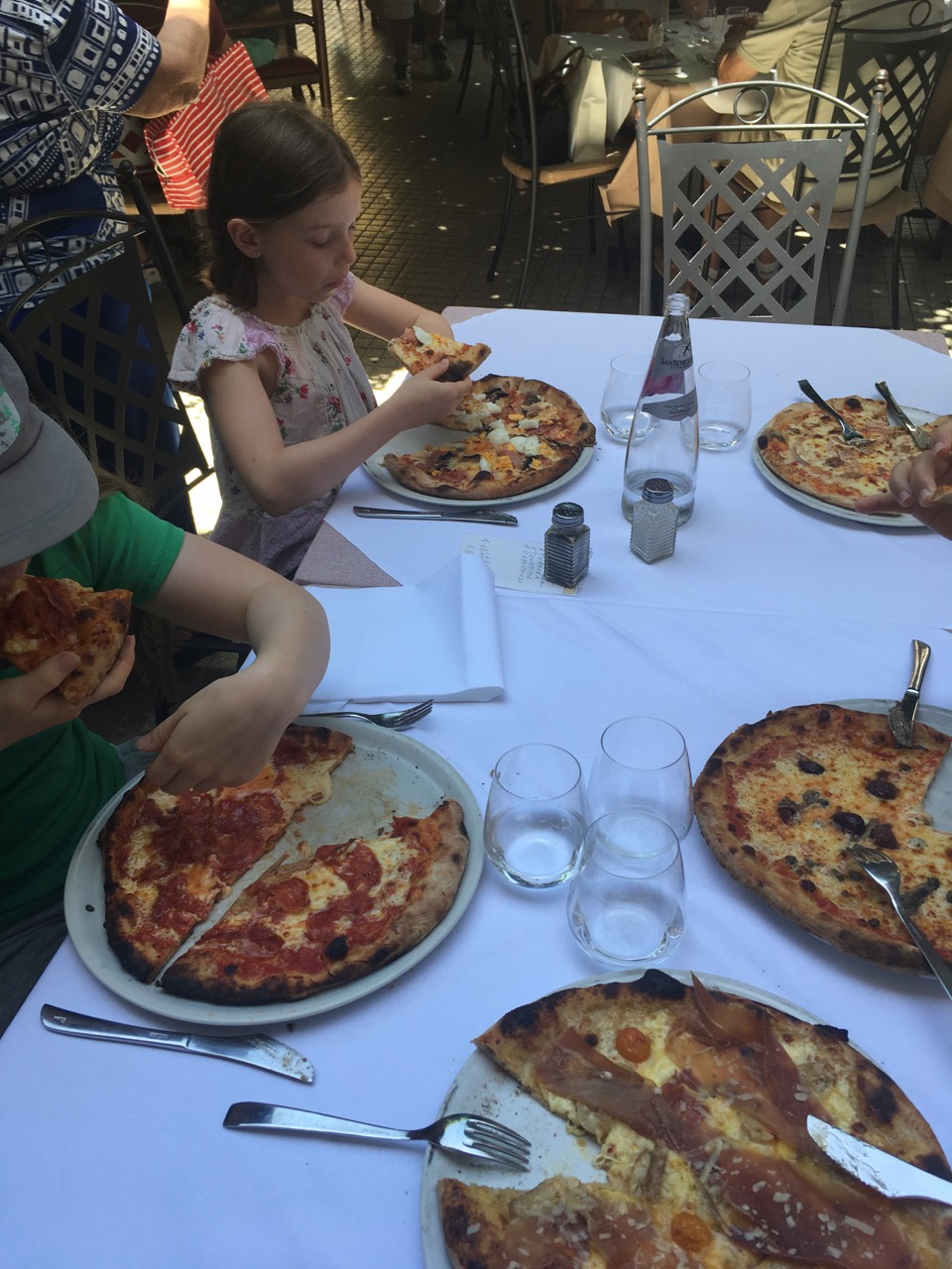 Ah oui, mais la faim nous aide ! D’autant qu’on avait promis aux enfants une pizza ce midi. On trouve sur une petite place, sous une tonnelle de vigne, une terrasse de pizzeria qui nous sert de larges pizzas, et on se régale !