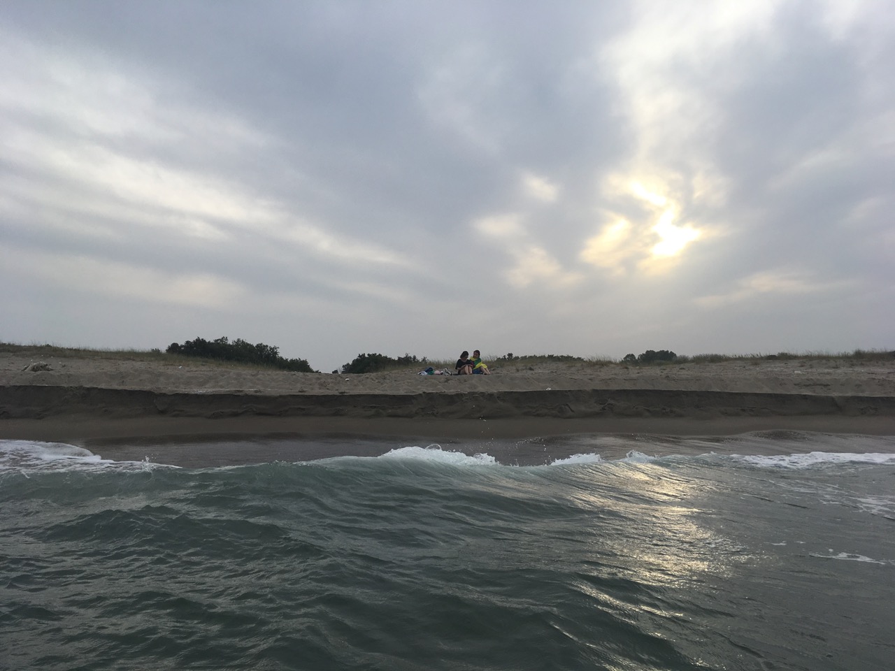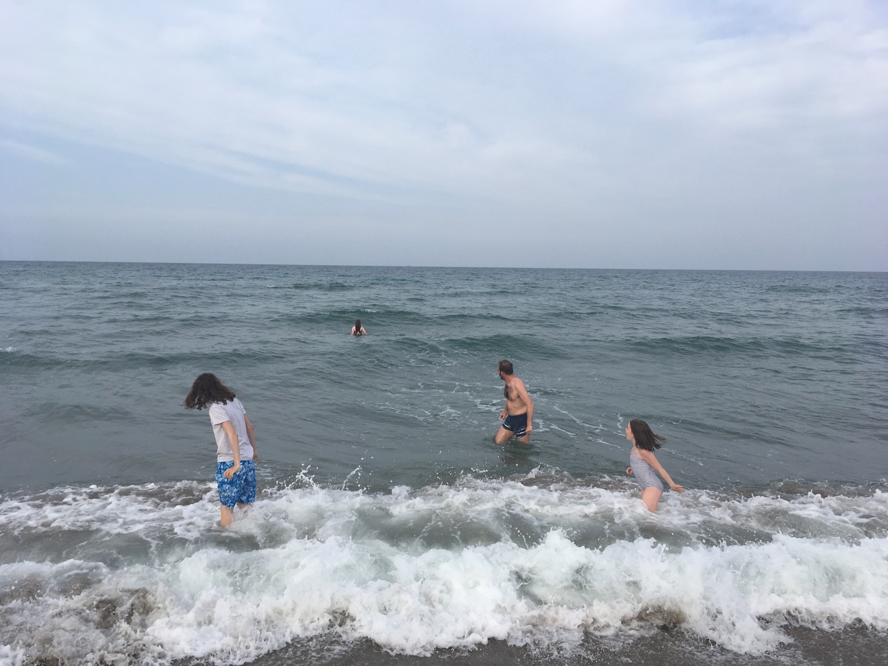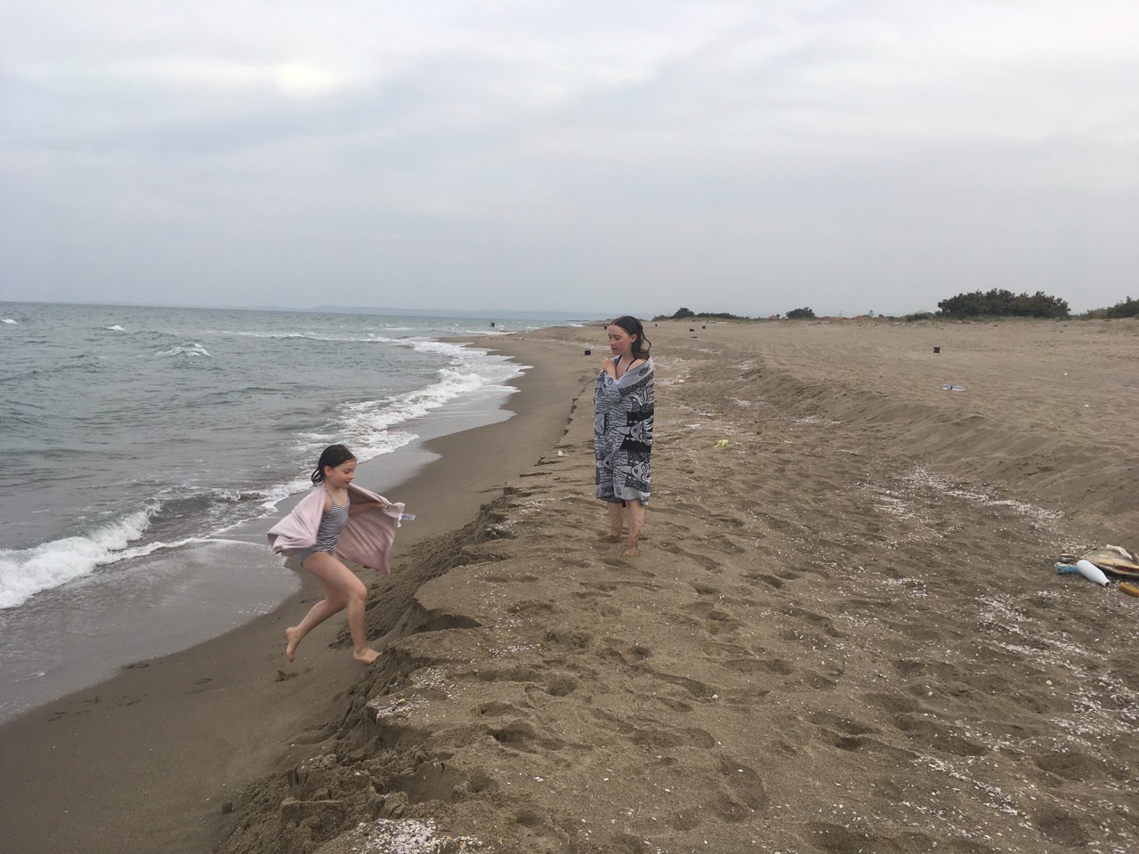 Et puis on se dit que c’est notre dernière soirée ici, alors on va À LA PLAGE ! Il y a un peu des vagues, et elle est encore plus déserte que d’habitude. Les filles sautent dedans, et même Gaël va se baigner !