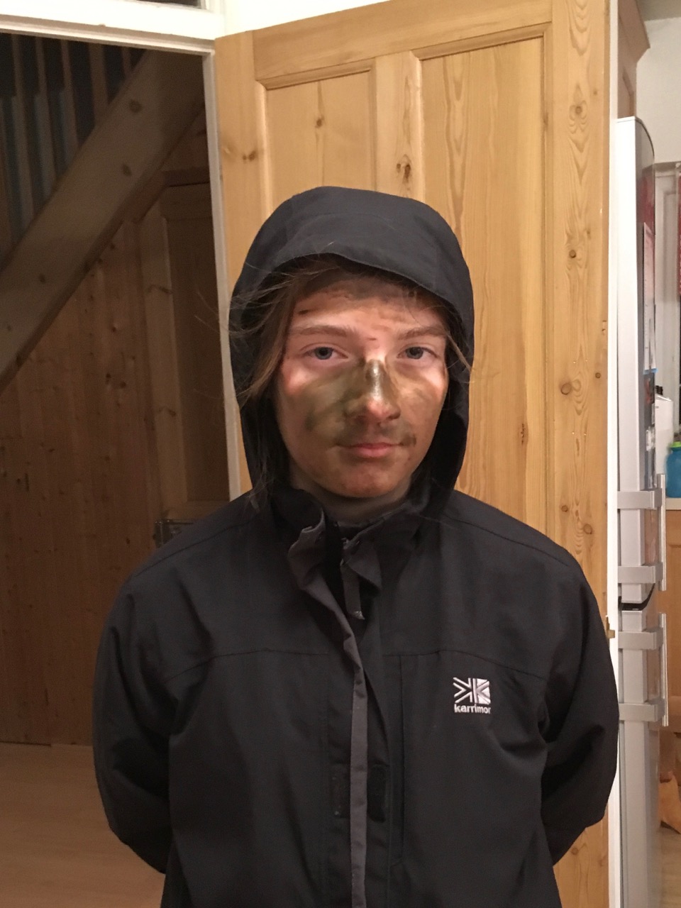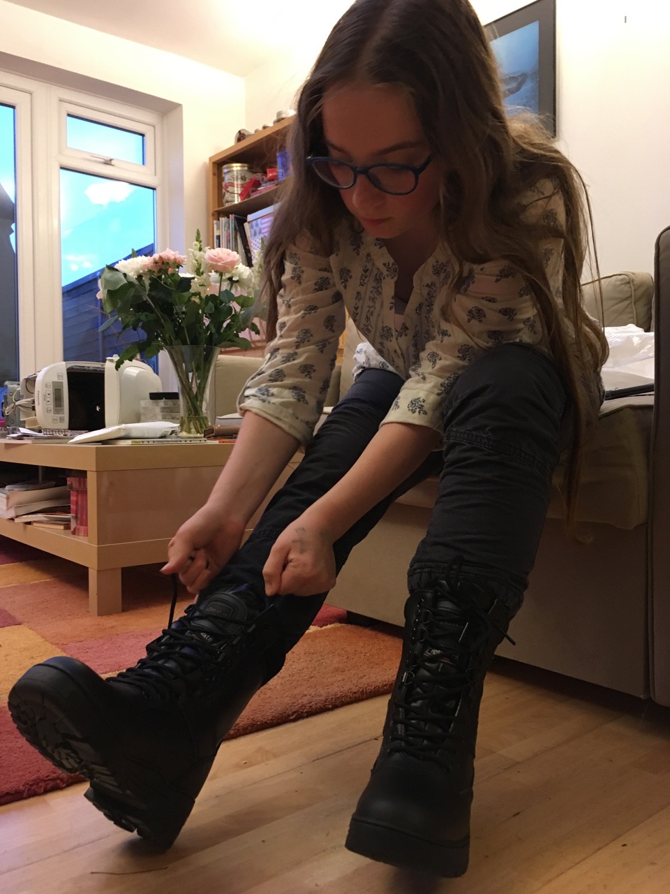 Elle a donc maintenant l’uniforme également — il a juste fallu qu’on achète les bottes règlementaires, en prenant une taille de plus parce qu’ils n’avaient pas de pointure assez petite pour elle…
