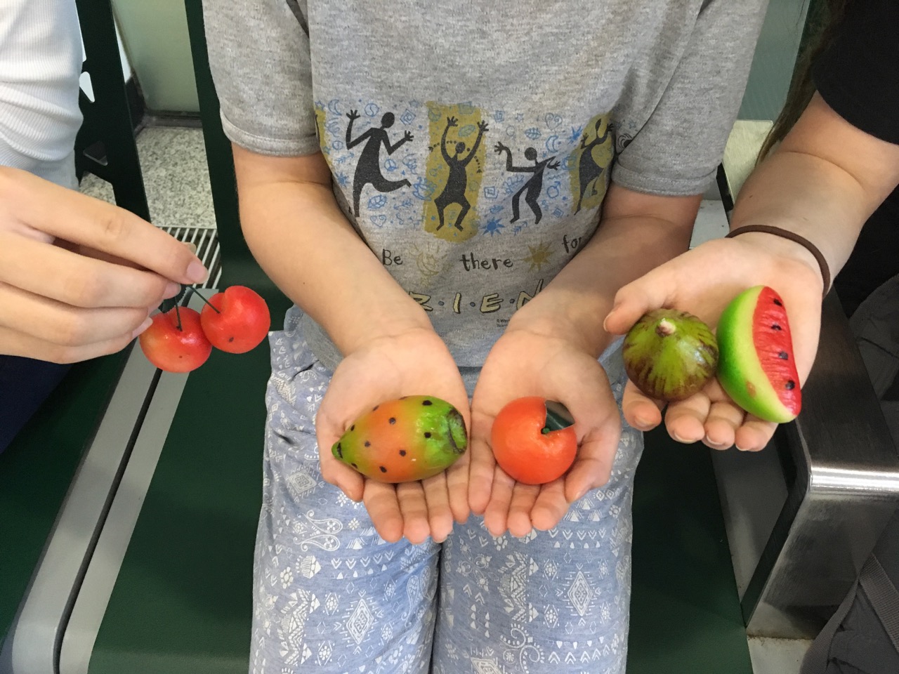 J’avais juste envie de montrer d’abord la dernière spécialité sicilienne, qu’on n’avait pas encore goûtée : les fruits en pâtes d’amande ! On s’en est pris un chacun à l’aéroport, en attendant l’enregistrement. On en avait vu des boutiques entières la veille à Taormina, mais on avait résisté…