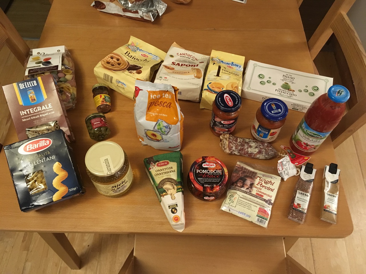 L’autre moment intéressant de la journée, c’était une dernière virée dans le supermarché du coin (un Auchan — pas très italien !) pour ramener quelques bonnes choses qu’on ne trouve pas chez nous ! Par exemple :
