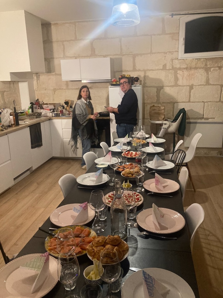 Ensuite, traversée de la France le mardi 23, et on se retrouve à Fronsac dans un grand gîte qu’on avait loué avec la famille de Anne. Là c’était plus agité, parce qu’on a eu à chaque repas entre 13 et 19 personnes ! La logistique a tenu bon, les menus avaient été amplement discutés en avance. Encore une fois on a très bien mangé ! (Malgré les fours récalcitrants…) Les coquilles Saint-Jacques, miam !
