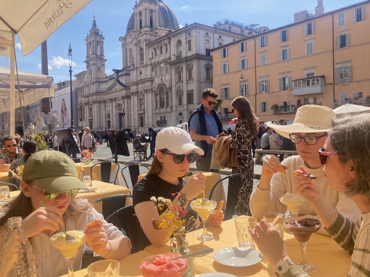 On y reste une bonne partie de la journée, puis quand les jambes sont fatiguées, on se dirige vers la Plazza Navona. Là on se pose en terrasse au soleil, en t-shirt au milieu des Italiens emmitouflés, et on s’offre une bonne glace. C’est le bonheur, d’autant plus qu’on a aussi droit à une langue de chat faite maison. Miam !