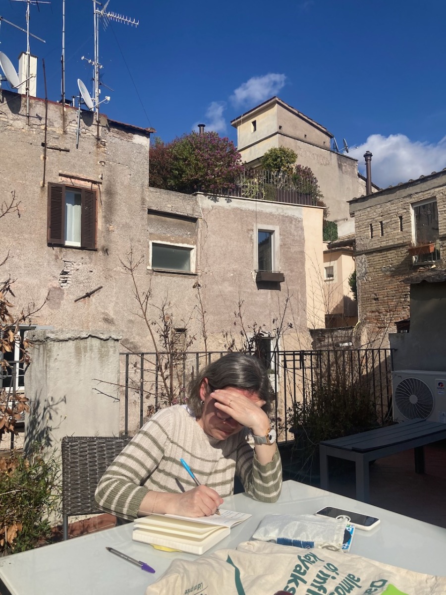 On revient au gîte par des petites rues pavées, le nez en l’air pour voir les plus belles terrasses, et on fait une pause.