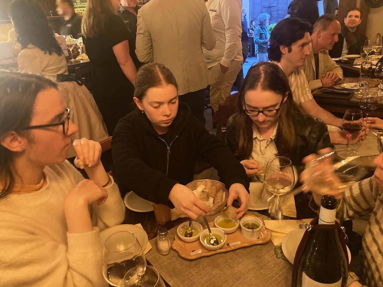 Bon, en fait c’était super sympa, on a dîné dans un bar à vins en bas de chez nous, “Il Goccetto”, et c’était délicieux. En plus, le cadre était vraiment sympa, dans un vieil immeuble avec plafond peint et poutres apparentes. On a fait une dégustation de 4 huiles d’olive différentes, de la plus douce à la plus amère. C’était la Dolce Vita !